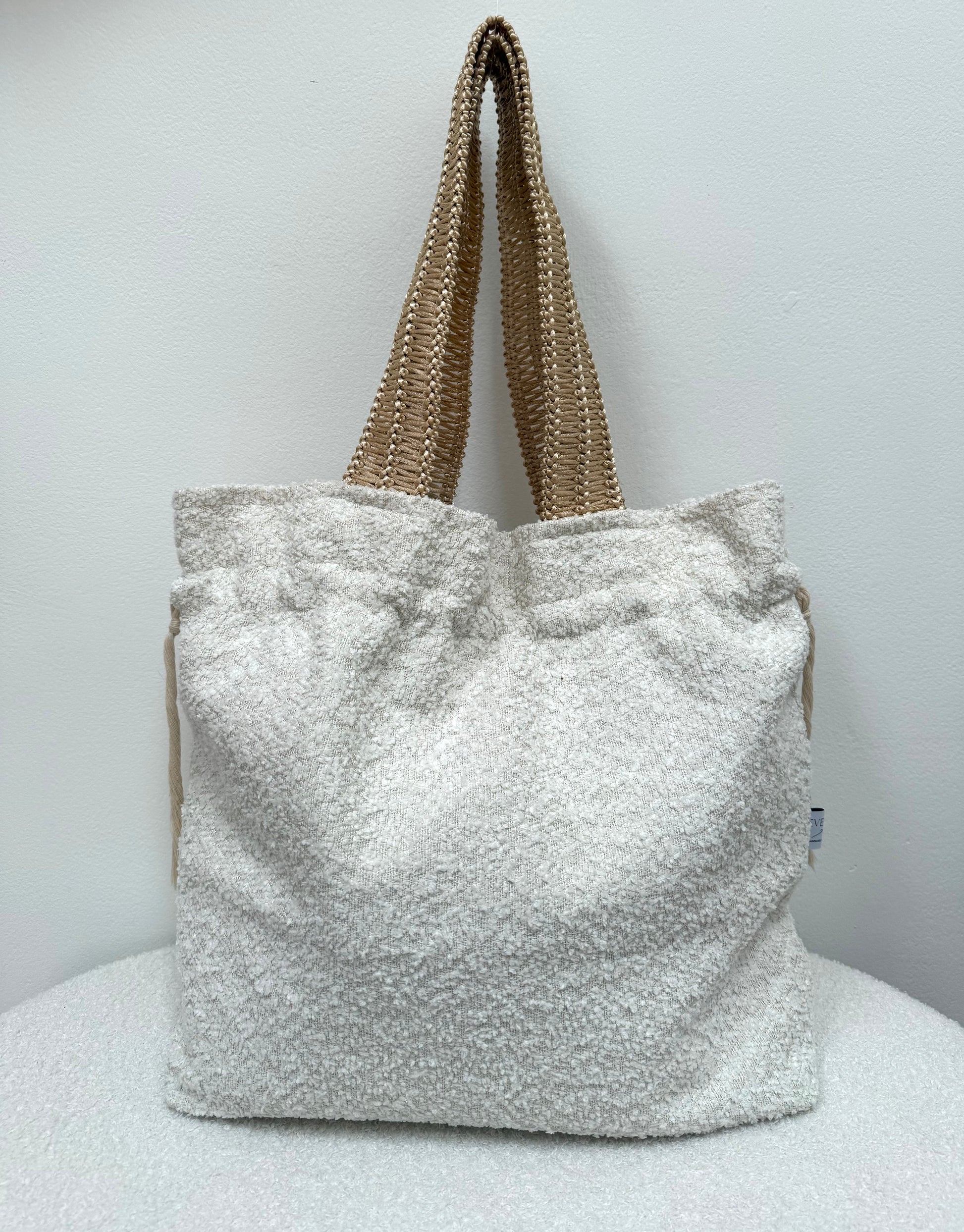 Material: Hochwertiger Boucle-Polsterstoff, Innenfutter aus Baumwoll-Webstoff, Henkel mit hochwertigem Glanz