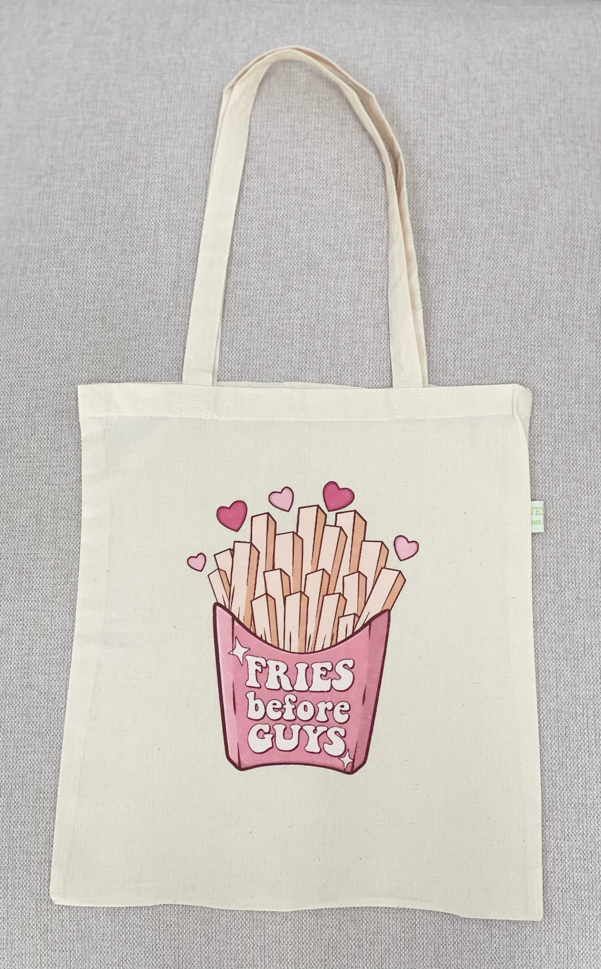 Material: Hochwertige Tragetasche aus Jute mit "Fries before Guys" Print