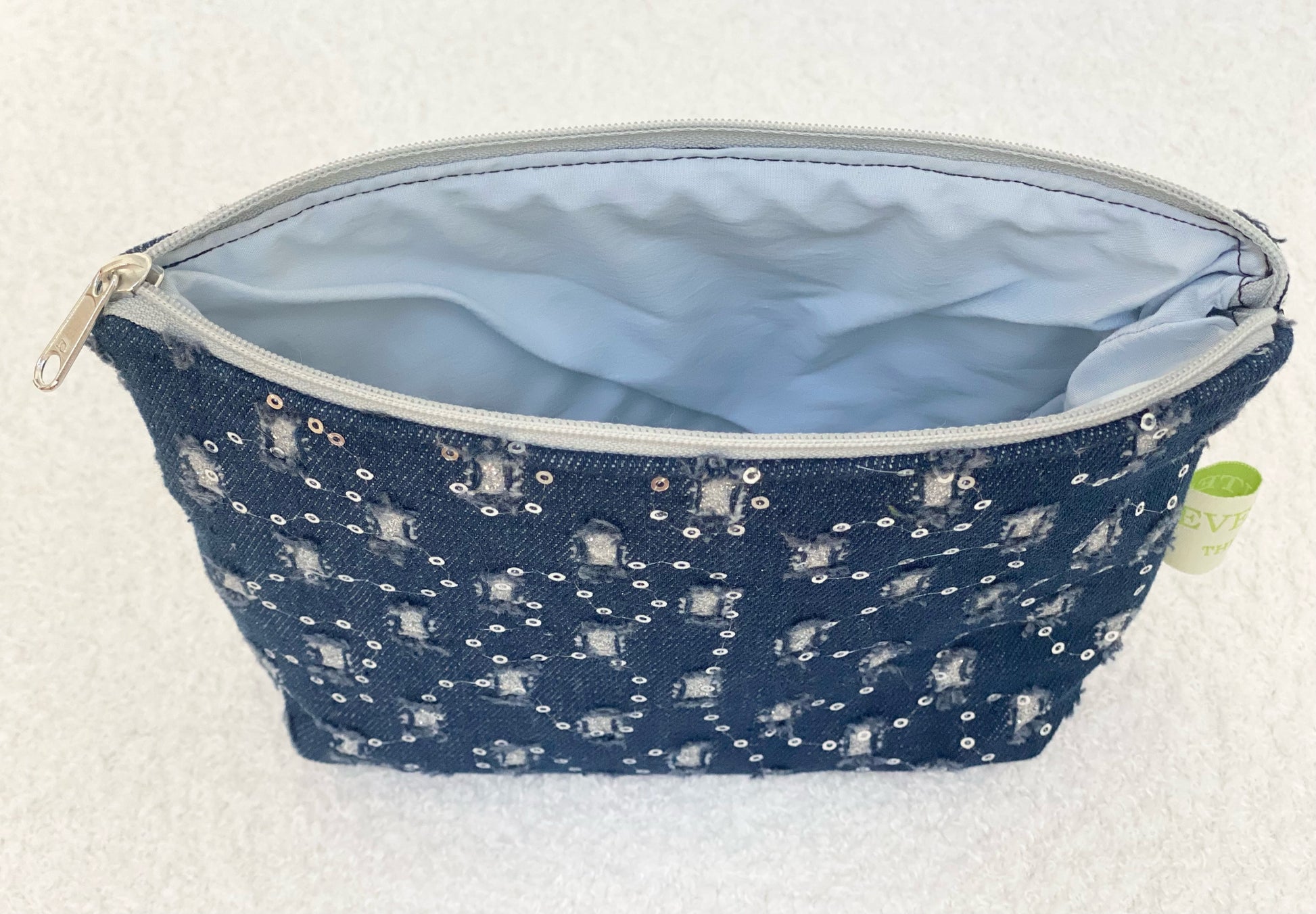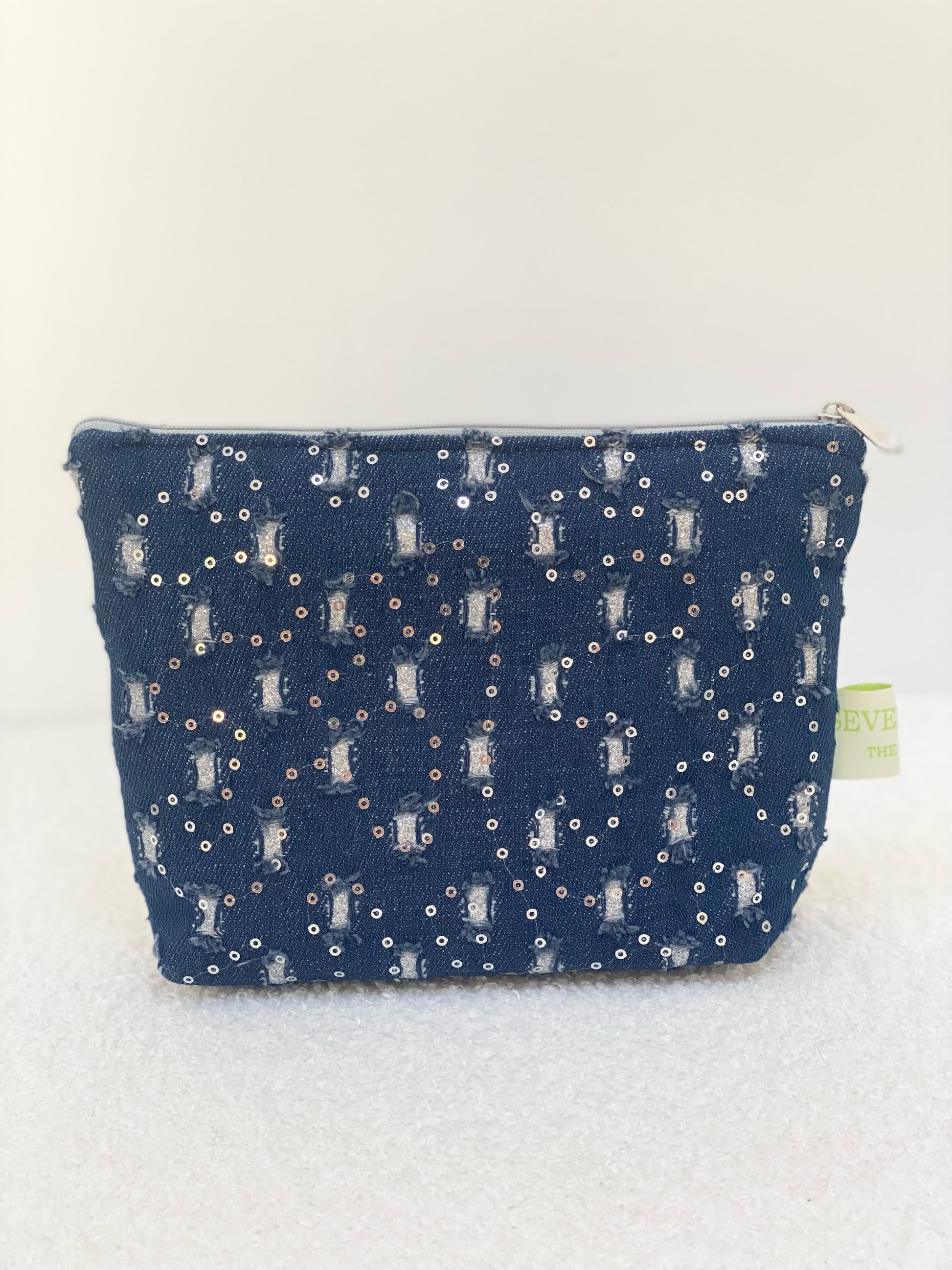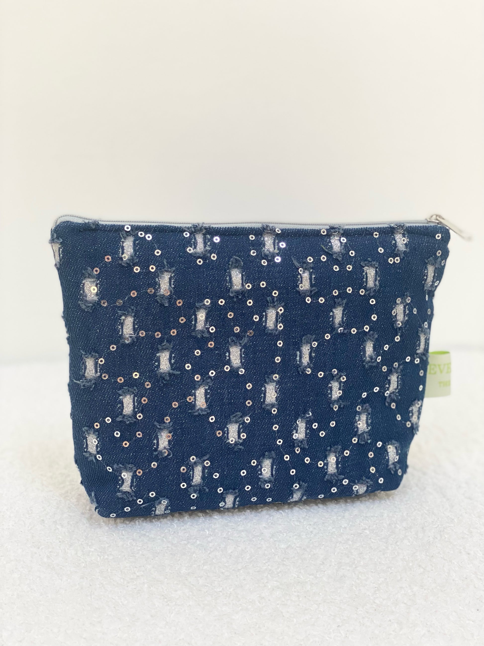 Material: Hochwertiger Jeansstoff mit Pailletten Applikation außen, Innenfutter aus dünnem Baumwollstoff